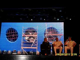 ![]() Im Hintergrund wurden Fotos von wichtigen Schiffsdetails gezeigt, die man sonst nicht zu sehen bekommt, wie die zum "Einparken" ohne Schlepperhilfe notwendigen Strahlrohre und die Antriebswelle. |