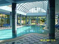 Nachdem ich vom Sonne-Ausweichen unter den Sonnenschirmen genug hatte, habe ich mir ein sehr ruhiges Plätzchen im Hallenbad gesucht. Nur ganz selten kam hier jemand vorbei. So hatte ich viel Ruhe zum Ruhen und Lesen. Praktisch war auch, dass die Sauna dort angesiedelt war. |